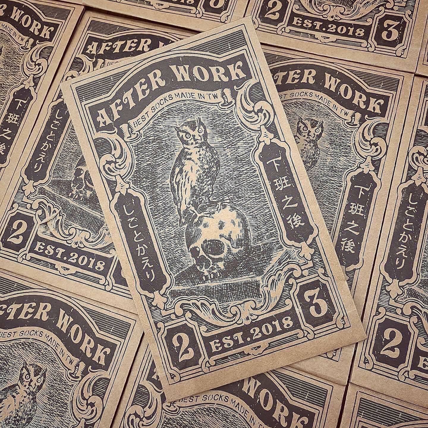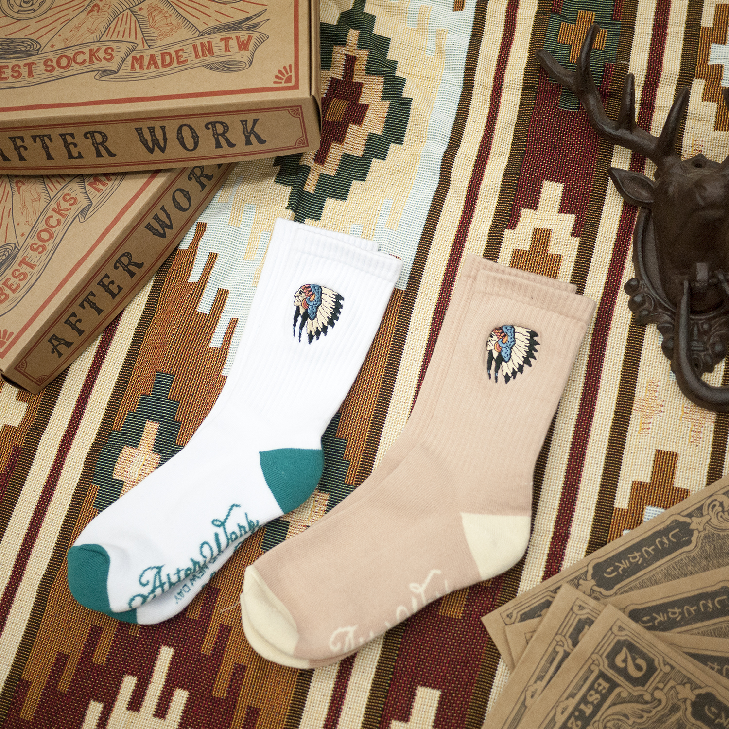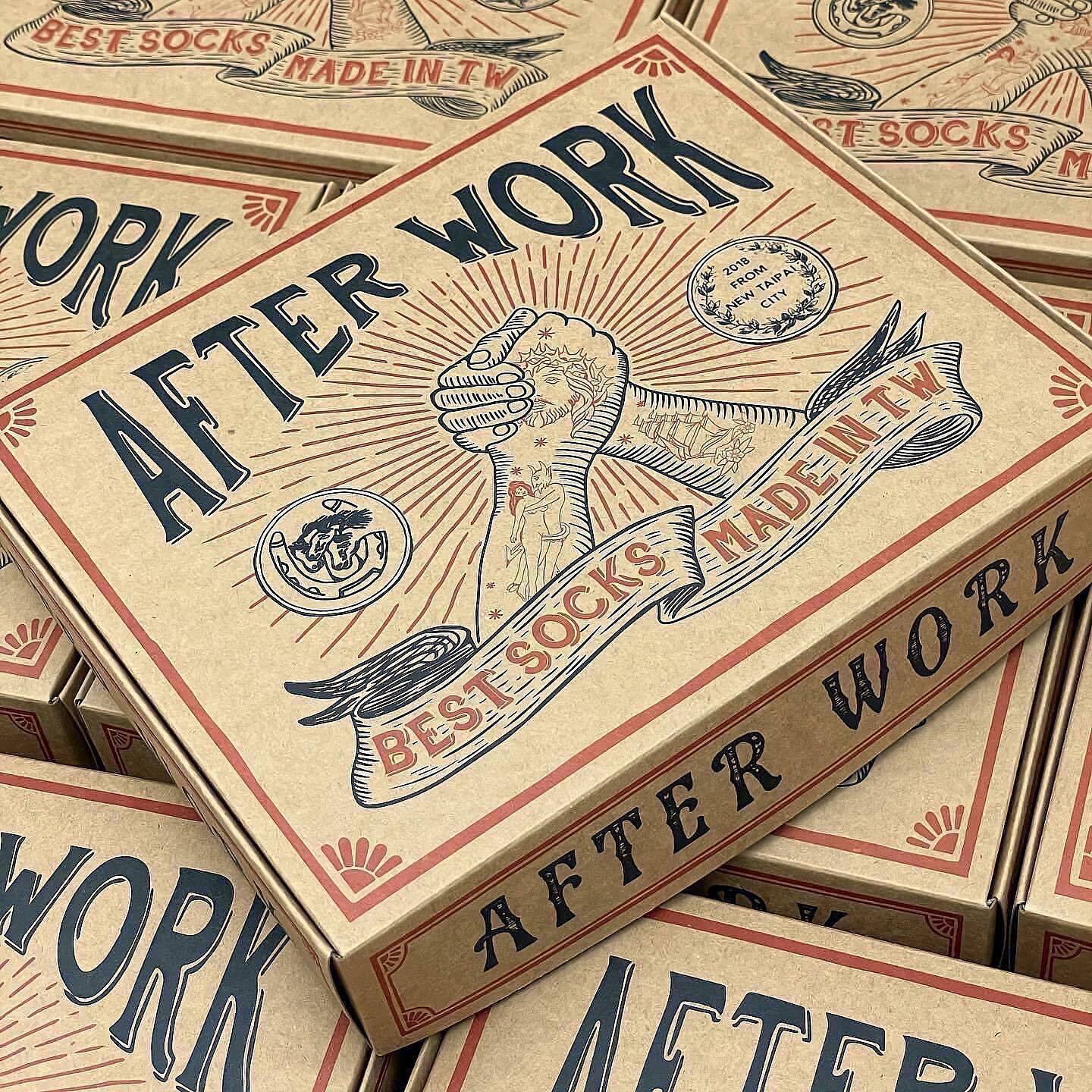 @afterwork_tw 以傳統美式或是戰爭時期老圖為主題發想,更聯名新浪嘻哈服飾品牌 @virusworld_ 將過往的經典圖素,以不同的方式與樣貌運用在襪子上面,舒適材質與精緻電繡圖案,蔚為好評的長襪單品,希望能用自己的方式,讓美好舊時代經典延續下去