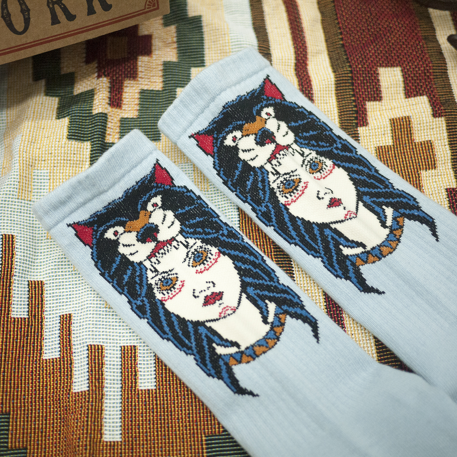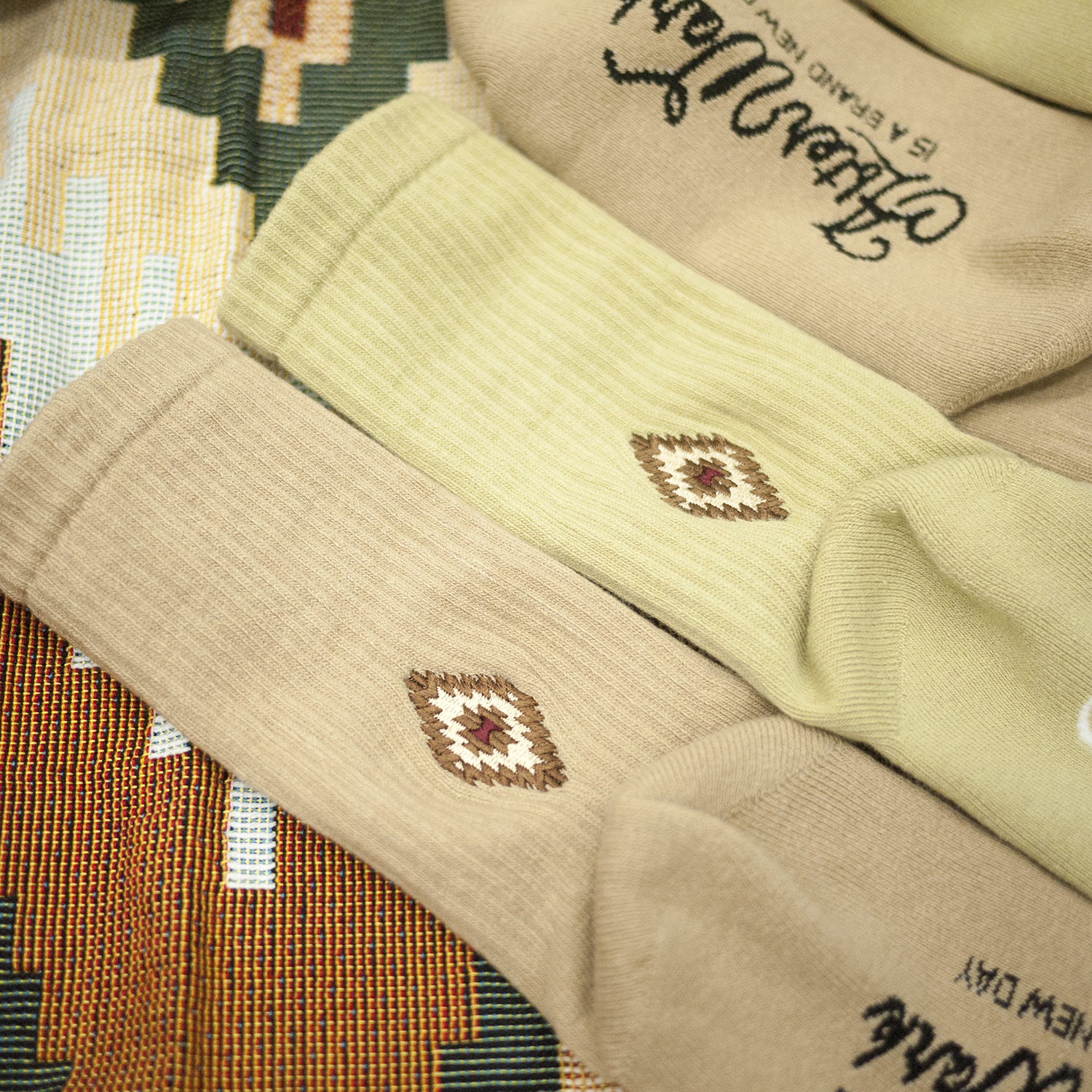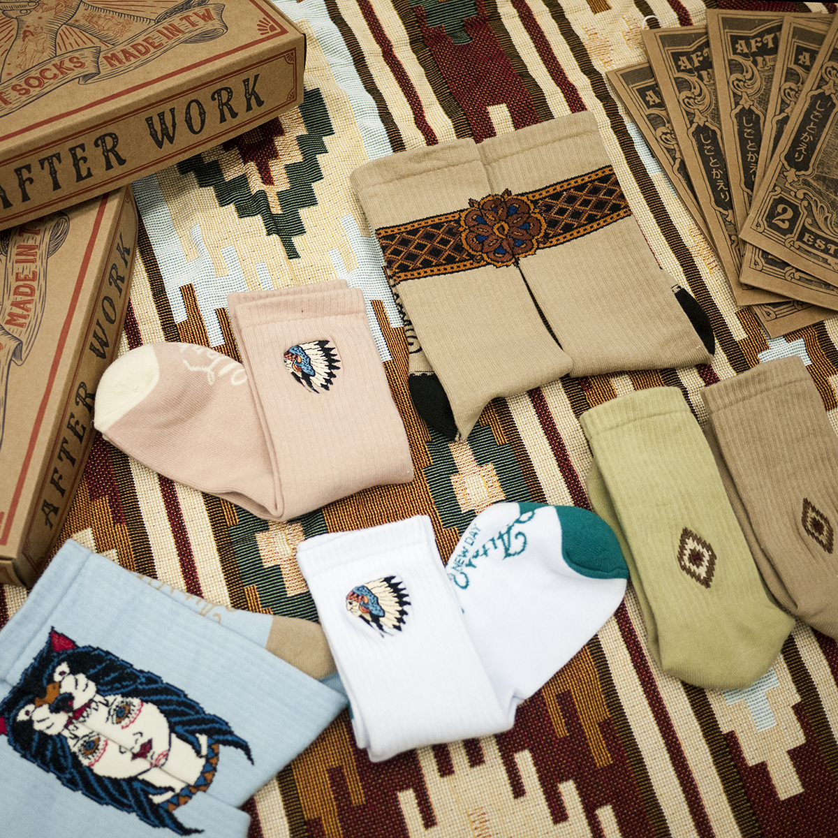 @afterwork_tw 以傳統美式或是戰爭時期老圖為主題發想,更聯名新浪嘻哈服飾品牌 @virusworld_ 將過往的經典圖素,以不同的方式與樣貌運用在襪子上面,舒適材質與精緻電繡圖案,蔚為好評的長襪單品,希望能用自己的方式,讓美好舊時代經典延續下去
