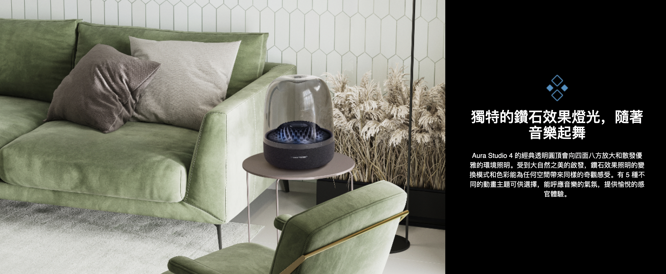 延續 Aura 系列標誌性的透明圓頂與 360 度聲場設計,Aura Studio 4 第四代將視覺與聽覺美學推向全新境界。全新加入的 水晶光柱燈效,靈感取自大自然的結晶紋理,會隨音樂節奏律動,打造如夢似幻的氛圍燈光秀。不僅是音響,更是空間中的藝術品。